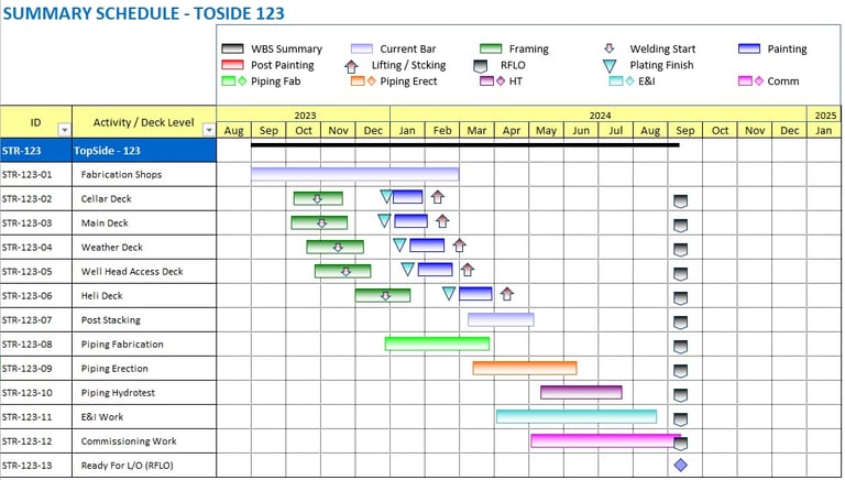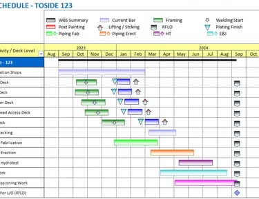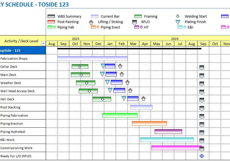 Easily recreate Primavera schedules in Excel similar to Primavera P6-style Gantt Chart format.