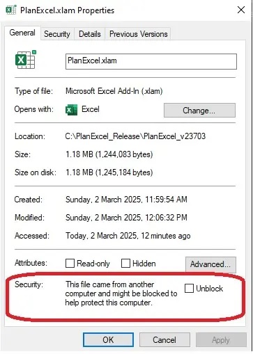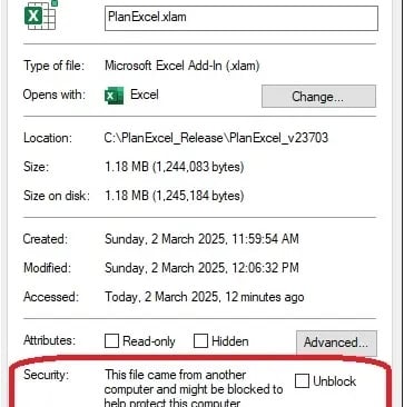 Right click on the files (PlanExcel.xlam & Install_PlanExcel.xlsm) and choose properties